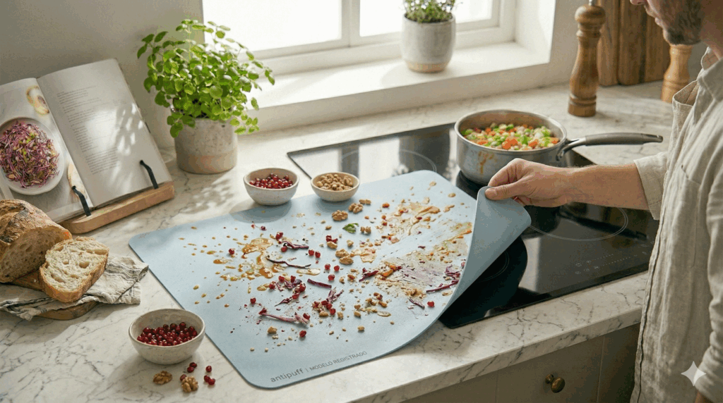 Desde mi formación técnica como arquitecta, busco soluciones donde la forma y la función se encuentran. Antipoff nació para resolver un problema real: mantener la pureza del diseño en la cocina sin el esfuerzo de la limpieza constante. Un invento único que protege tu inducción con la máxima elegancia.